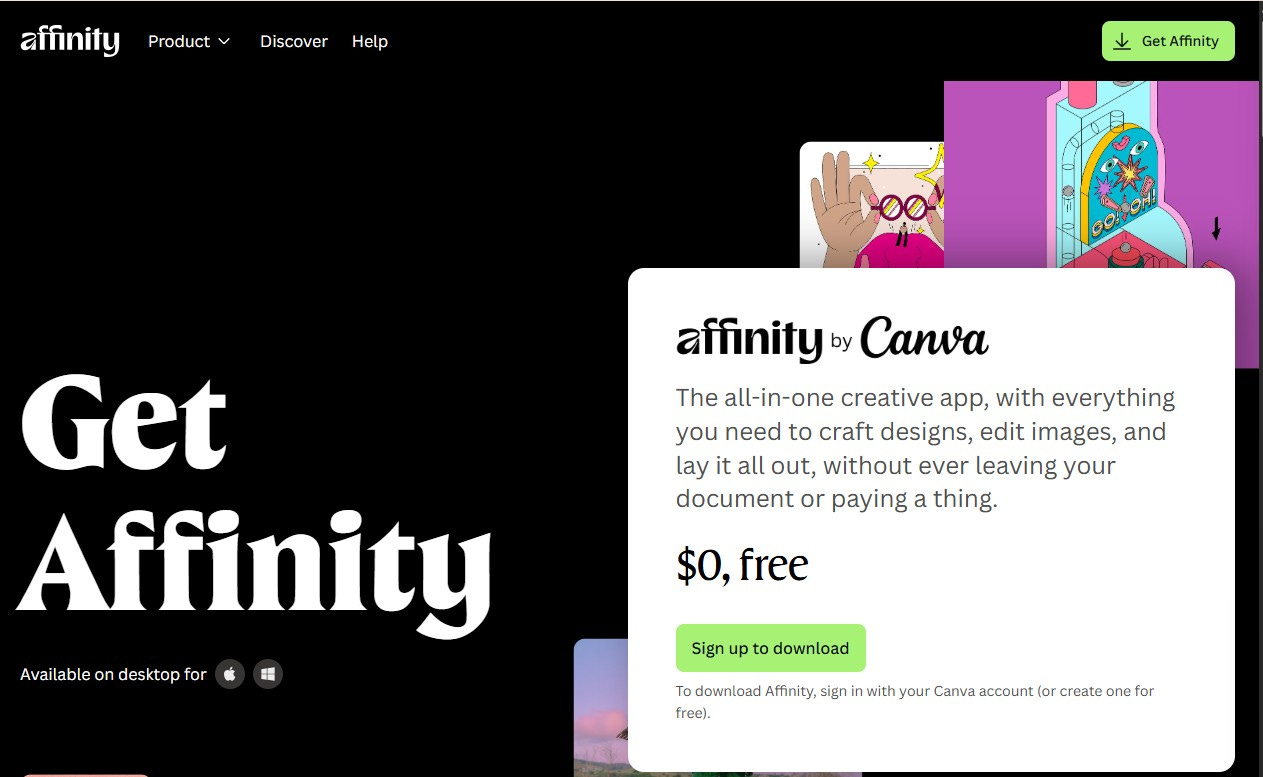 If you don’t already have a Canva account, you only need to set up a free account to unlock Affinity. Side note - a free account on Canva is usually plenty for most users, there’s a lot of value there on its own. (Disclosure: I use Canva Pro and have for years).