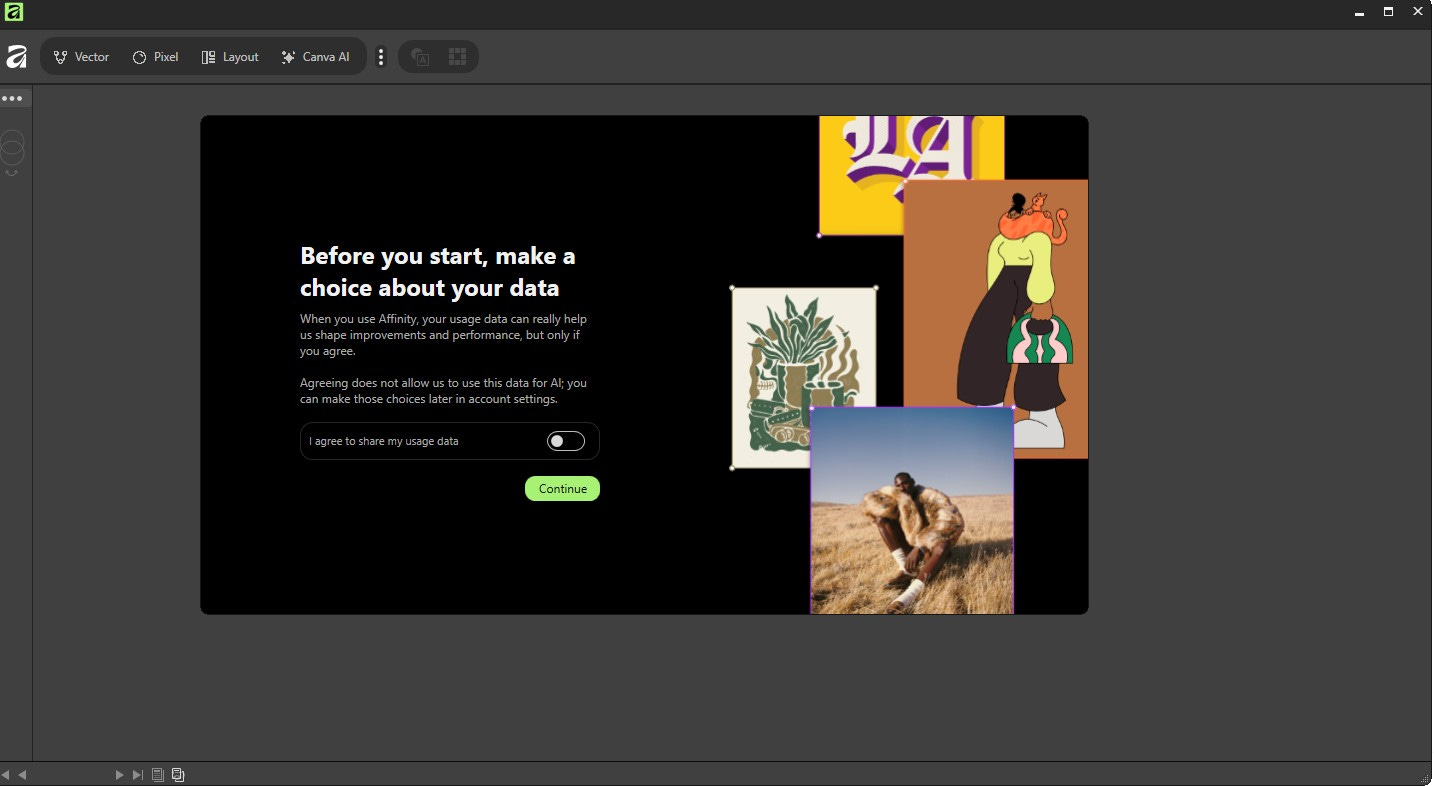 On the Welcome to Affinity! window Click ‘Continue’ button to connect Affinity to your Canva account (or you can choose to sign in with another Canva account).
